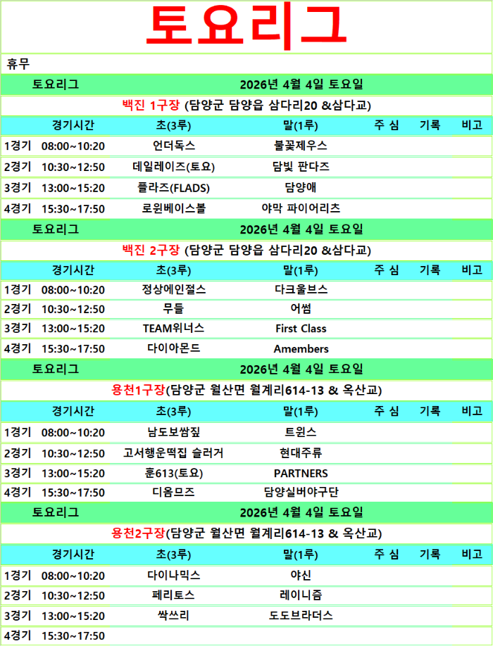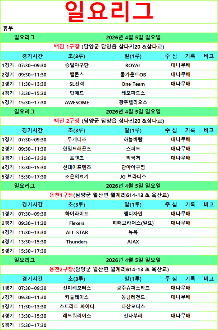 3월 28.29일 경기일정입니다.(휴무팀 수정)